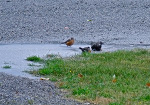 covered deck, him with his coffee cup and me with my mocha, and just enjoyed the sound of the rain and the freshness of the air. Even the birds were enjoying themselves in a puddle in our driveway where the hard ground tried to absorb all the rain and could not. But the birds cared not that the water had not sunk into the ground. They were waiting for the advantage of the rain to cause the worms to come up, and while they waited, they were making the most of the rain and bathing in it. That, I think, is the wonder that we miss out on. I need to be more like the birds this morning. Make the best use of what comes my direction and see the best in it. I need to bathe in the showers of God’s blessings, knowing that whether I am showered in sorrow or showered in joy, that I can dance in the showers that come.