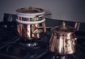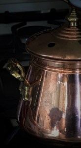 One of our excursions at the end of the day, was to go into a thrift store and look around.  It’s fun to see what he sees, and because he is still a bit shorter than me, he sees things I don’t always see.  I always look in the glassware to see if I see any of my grandmother’s dishes, or see any Farmers Rose, because I found a cup and saucer that way once.  So, lo and behold, I walk down the aisle and find a glass dish like my grandmother’s.  My grandson said, “Grandma, that doesn’t look like it’s a very good one.  It has stuff all over it and some spots on it.  It’s looks all cloudy.”  So I told him that when I get home, I will wash it all up and it will look like new!  Down the next aisle, I see this copper double boiler and another copper pot.  So cute!  So I put them in the cart.  The double boiler he was ok with, but the little pot had a couple of spots that were worn and didn’t look as shiny as the rest of it.