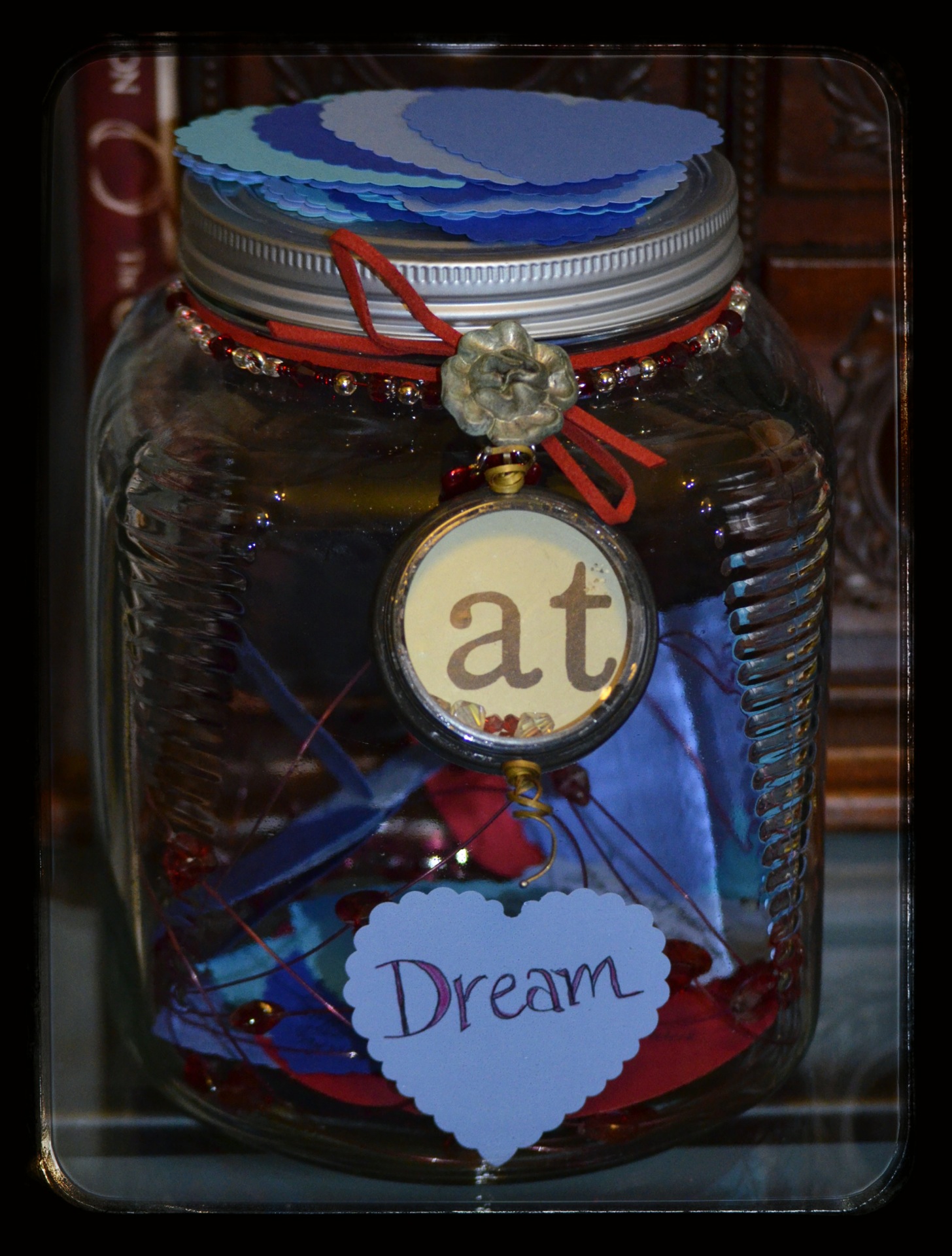 I just finished another project for my window that has been on my desk for weeks. I now have curtain pull backs that are my Grandma’s lace my mom had, and two of her red buttons from her jar. I like the whimsical look in The Loft.